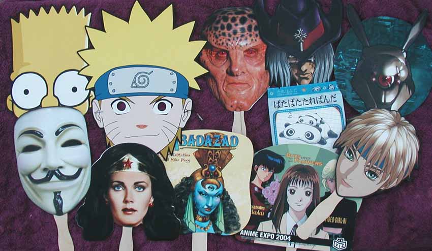 Fans from various shows These fans are promos from Anime Expo and Comic-Con. They are: V for Vendetta, Wonder Woman, Simpsons, Requiem, Naruto, Maison Ikkoku, Appleseed, Babylon 5, Gungrave, Kirarin Revolution, Ragnarock, Tare Panda & others. The fans are a thin coated cardboard. They are $2.00-3.00 each + shipping.